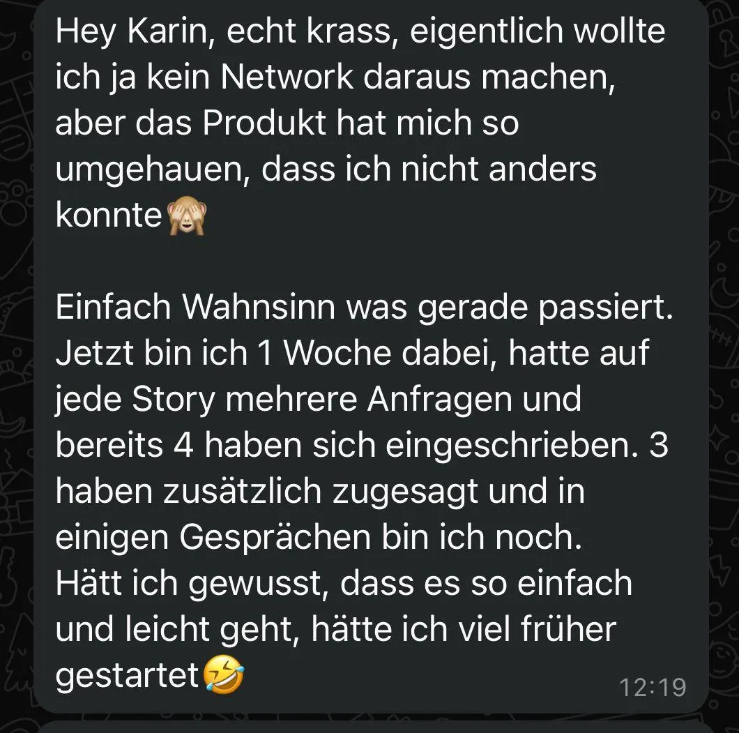 Ich schwor mir, nie wieder Produkt-Network – zu anstrengend, zu wenig Geld. Doch meine Freundin überzeugte mich mit einem einfachen Test. Das Ergebnis? Ein einzigartiges Produkt, und plötzlich war ich wieder dabei. Passives Einkommen, ohne Stress, ohne Zoomcalls – genau das, wonach ich gesucht habe.
